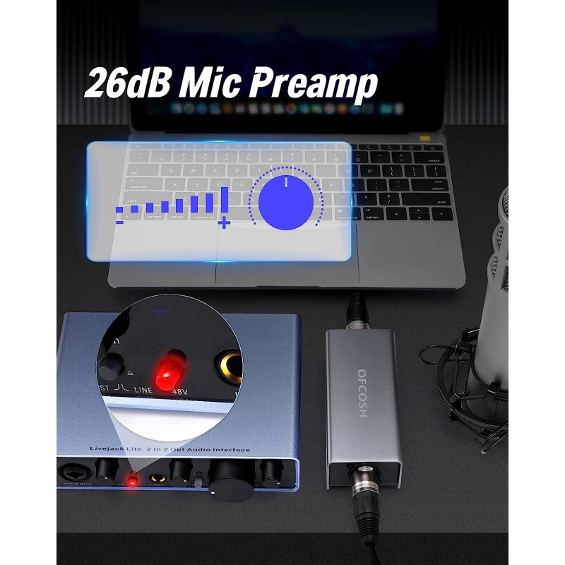 OFCOSH Microphone Preamp for Dynamic Mic, OF-1 Microphone Preamp Booster, Microphone Booster, Mic Preamp, up to +26dB, Ultra-Clean Gain, Noise Reduction for Home Studio, Podcasts, Streaming, Recording